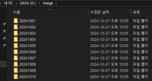D:\merge 경로 아래 일자별 폴더내에 있는 개별 파일을 D:\merge 폴더로 모두 꺼내주는 코드 입니다.